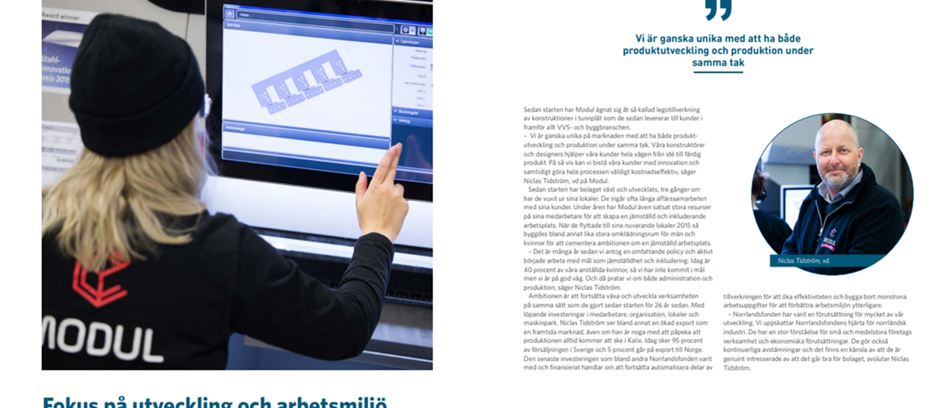 Modul säger tack till Norrlandsfonden för fin artikel i Norrlandsfondens senaste nummer av kundtidningen Framgång för Norrland (Nr 2 2023) som utkom 9 oktober 2023. Kul att vi på Modul får chans att berätta om vår verksamhet som legoproducent i tunnplåt, företagets historia, tillväxt och oss som industriarbetsgivare med säte, kontor, produktutveckling och produktion i Kalix, Norrbotten.